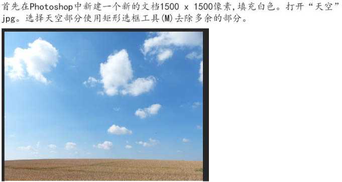 1、首先在Photoshop中新建一个1500 * 1500像素文档,填充白色。打开天空素材,用矩形选框工具选择天空部分。