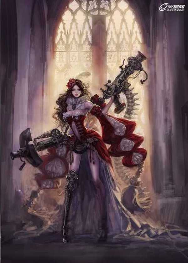 因为是蒸汽朋克时代背景,需要融合那个时代的机械元素。这样的设计就体现在女枪手的两把长枪上,为了画面更加和谐,我将她的腿也设计为机械的,所有金属物件上面都有欧式的雕花彰显高贵奢华的气质,
