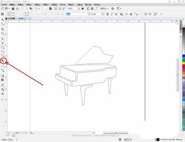 3、点击【文本工具】,在作图区域拉出一个文本框,输入文本内容:MHSJS001 PIANO,并按图示设置好文本的字体以及文字大小。选中文本,点击鼠标右键-【转换为曲线】将文本转曲(如图所示);