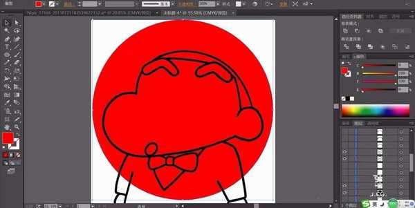 2、我们用红色填充圆形的路径,我们用黑色填充小新的头像路径。