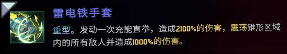 雷电铁拳套按下以后自动蓄力,且在约0.5秒以后自动释放(强制蓄力,时间不能多不能少),飞行距离略小于满蓄力的充能铁拳套。雷电铁拳套每次飞出去的距离和造成的伤害百分比都是一致的。不同的是雷电铁拳套会在命中第一个对手以后眩晕目标并停下,然后对目标身后释放冲击波(冲击波的范围比视觉效果更大更广)。如果你的突进拳将对手击退至后方,他甚至会受到他自己的冲击波伤害